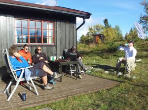 Lørdag våknet vi på ny opp til ganske så fint vær, og tre av fire dro inn i fjellet for å gå "den nye ruta" til toppen av Ongsjøfjellet. Frokosten ble inntatt i "puben" rett under toppen av fjellet i strålende solskinn.